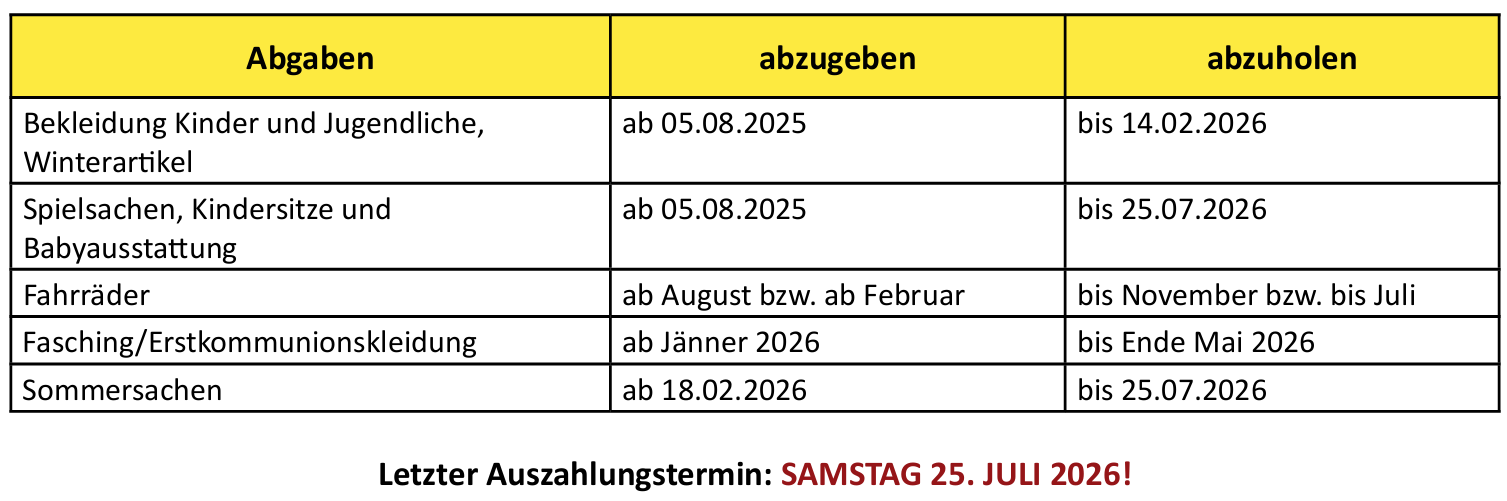Wir übernehmen keine Haftung bei Diebstahl, Verlust und Beschädigung. Wenn die angegebenen Abholtermine nicht eingehalten werden, erlischt jeglicher Anspruch. Danach werden Bargeld und Ware Eigentum des Eltern Kind Zentrum Brixen VFG.