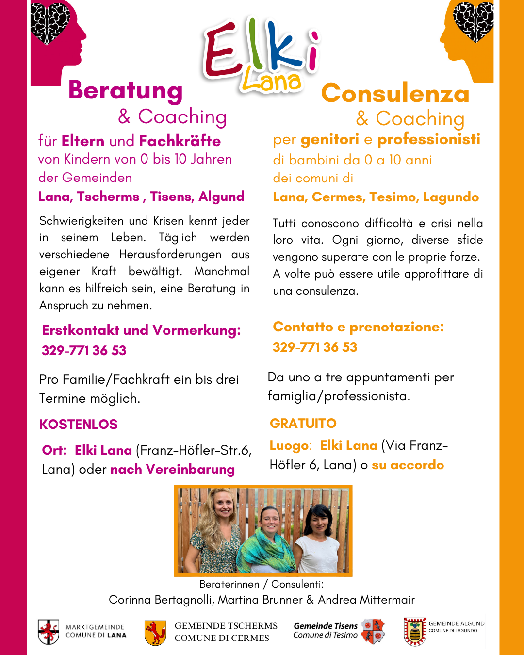 Die angegebenen Daten werden vom Eltern-Kind-Zentrum (Elki) Lana VFG im Sinne des gesetzesvertretenden Dekrets vom 30.07.2003 Nr. 196 (Datenschutzkodex) verarbeitet.